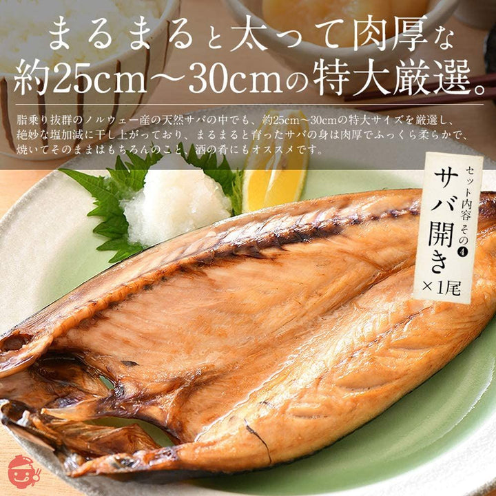 サバ開き×1尾まるまると太って肉厚な約25cm~30cmの特大厳選。 脂乗り抜群のノルウェー産の天然サバの中でも、約25cm~30cmの特大サイズを厳選し、絶妙な塩加減に干し上がっており、まるまると育ったサバの身は肉厚でふっくら柔らかで、焼いてそのままはもちろんのこと、酒の肴にもオススメです。 |