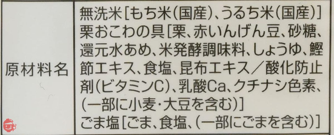 原材料:無洗米(もち米(国産)、うるち米(国産))、栗(栗、赤いんげん豆、砂糖、還元水飴、米発酵調味料、しょうゆ、鰹節エキス、食塩、昆布エキス/ 酸化防止剤(ビタミンC)、乳酸Ca、クチナシ色素)、ごま塩(ごま、食塩)