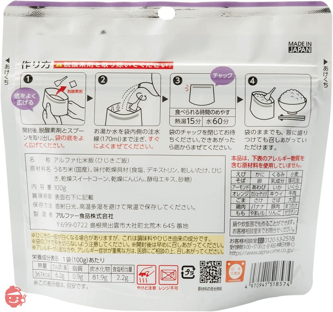 ※保存期間は製造日からの期間です。※商品によっては期間が短くなる場合があります。※直射日光および高温多湿をさけて保管し、揮発性のある物質(ガソリン・灯油等)と一緒に保管しないようにしてください。※お湯を入れる前に脱酸素剤を取り除いてください。※商品のパッケージ、仕様、価格等は予告なく変更となる場合がございます。※直射日光、高温多湿を避けて常温で保存してください。※米アレルギーが心配な方や、アレルギー症状が重篤な方は、医師にご相談の上、召し上がってください。※開封後は早めに召し上がってください。※袋のフチで手を切らないよう注意してください。