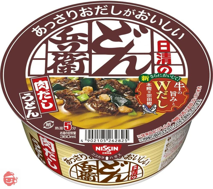 "Wだし" であっさりとした味わいの「どん兵衛」。つるみのあるもちもちとした食感のうどんと、本鰹と宗田鰹の2種の鰹だしに牛のうまみが溶け込んだ甘めのつゆ。大豆ビーフ、揚げ玉、ワカメ、ネギと豊富な具材が特長です。