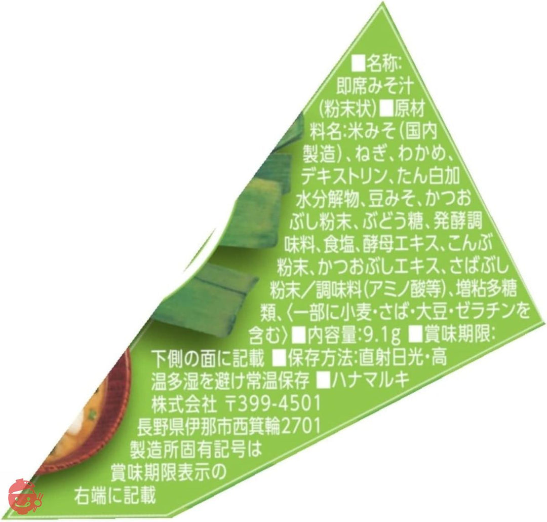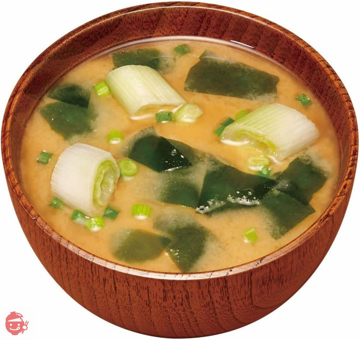 原材料:米みそ、ねぎ、わかめ、デキストリン、ぶどう糖、豆みそ、かつおぶし粉末、発酵調味料、食塩、たん白加水分解物、こんぶ粉末、酵母エキス、かつおぶしエキス、さばぶし粉末、調味料(アミノ酸等)、増粘多糖類、<原材料の一部に小麦を含む>