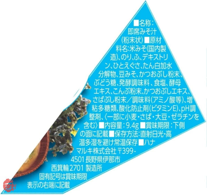 原材料:米みそ、のり、ふ、デキストリン、ひとえぐさ、豆みそ、かつおぶし粉末、ぶどう糖、発酵調味料、食塩、たん白加水分解物、こんぶ粉末、酵母エキス、かつおぶしエキス、さばぶし粉末、調味料(アミノ酸等)、増粘多糖類、酸化防止剤(ビタミンE)、pH調整剤、<原材料の一部に小麦を含む>