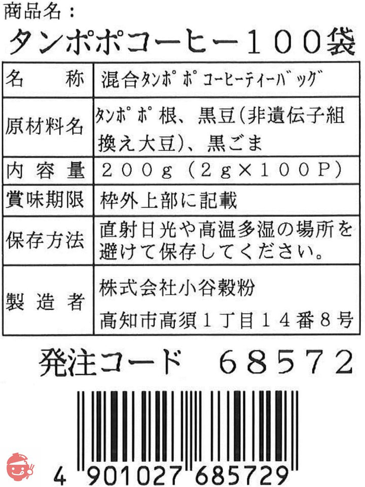 | 原材料 | タンポポ根、黒豆(非遺伝子組換え大豆)、黒ごま |