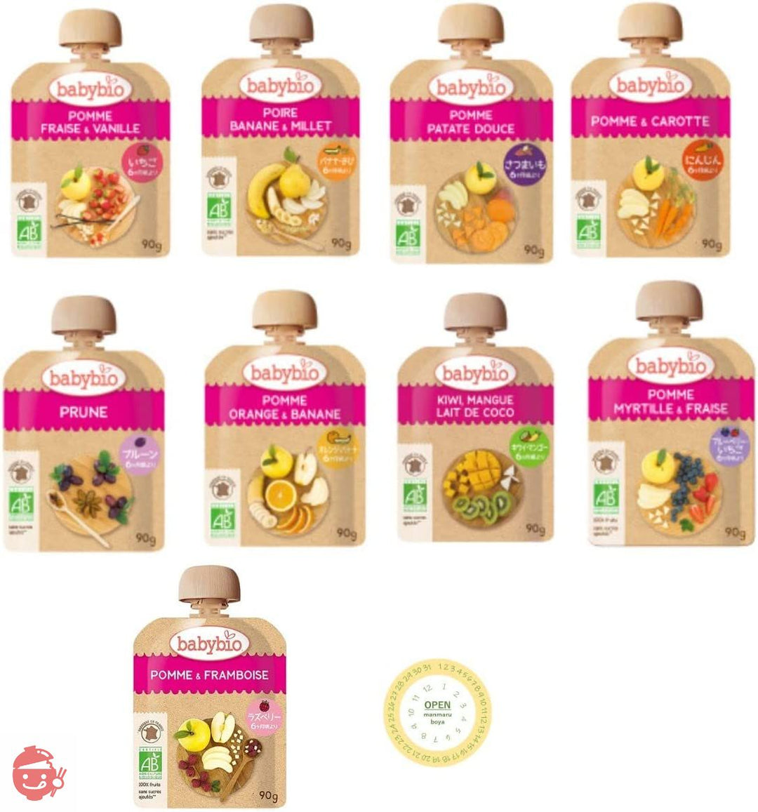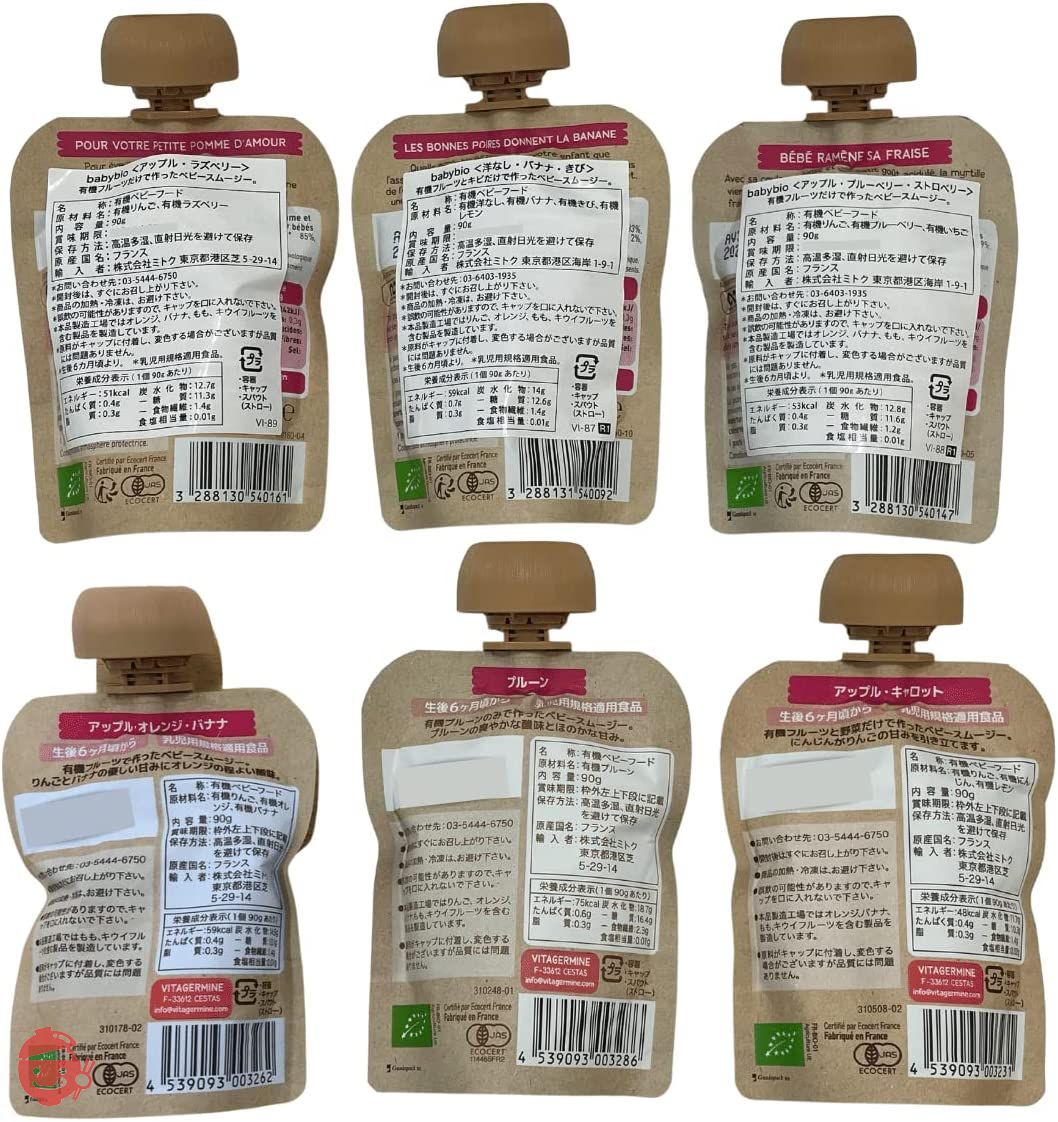 原材料:有機りんご、有機にんじん、有機レモン、有機さつまいも、有機いちご、有機バニラ、有機オレンジ、有機バナナ、有機プルーン、有機キウイフルーツ、有機マンゴー、有機ココナッツミルク、有機ブルーベリー、有機ラズベリー、有機洋なし、有機きび