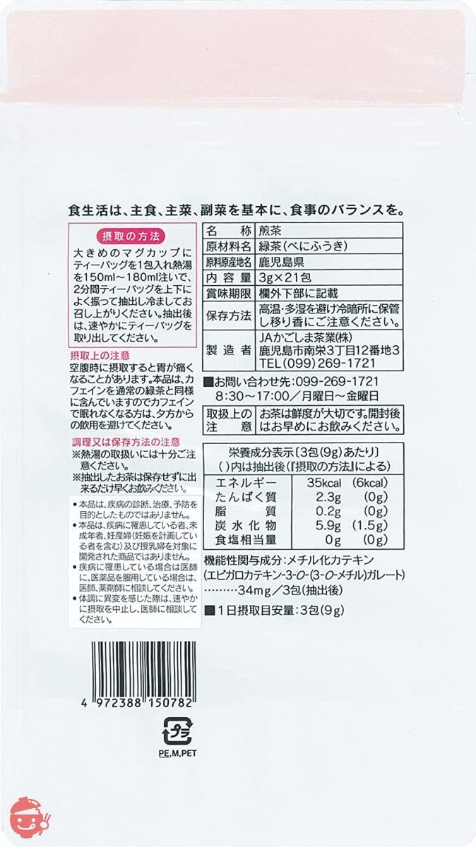 カロリー:3包(9g)あたり、( )内は抽出後『摂取の方法』による。エネルギー35kcal(6kcal)