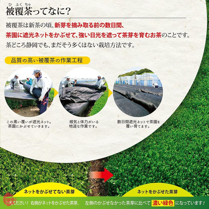 遮光ネットで茶園を遮光することで、茶葉の葉緑素が増え、濃い緑色になります。この葉で淹れたお茶の色は、とても美しい緑色です。旨味成分の「テアニン」が多いので、渋味が少なく、まろやかでうま味の強いお茶です。被覆して栽培したお茶独特の、上品な香りがあります。