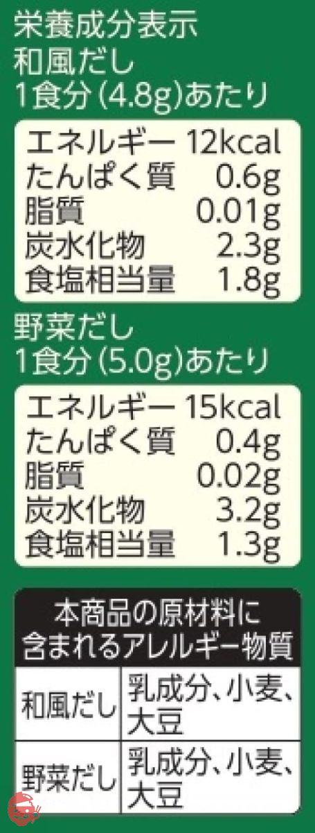 | 原材料 | 原材料:[和風だし] 乳糖(アメリカ製造)、食塩、鰹エキス粉末、鰹節粉末、砂糖、いりこ粉末、粉末醤油、でん粉、植物蛋白加水分解物、発酵調味料、昆布粉末、酵母エキス粉末/調味料(アミノ酸等)、カラメル色素、酸化防止剤(V.E)、(一部に乳成分・小麦・大豆を含む)[野菜だし] 乳糖(アメリカ製造)、食塩、でん粉、植物蛋白加水分解物、野菜エキス粉末、いりこ粉末、酵母エキス粉末、砂糖、醤油、鰹エキス粉末、オニオン粉末、粉末油脂、こしょう/調味料(アミノ酸等)、増粘剤(キサンタン)、カラメル色素、(一部に乳成分・小麦・大豆を含む) |