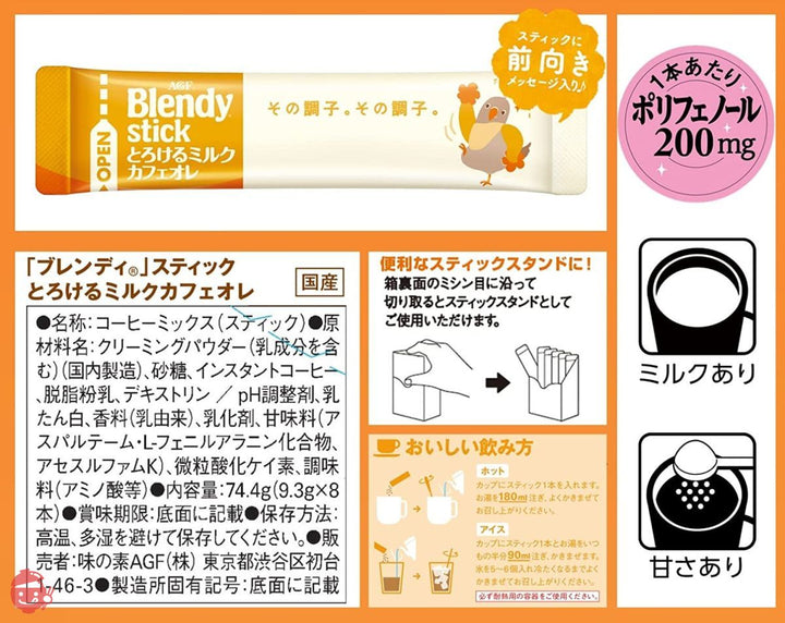 AGF(エージーエフ) 「ブレンディ スティック」 とろけるミルクカフェオレ8本は、とろけるようなミルクのコクと、しっかりとした甘さで気分もお腹も満たされるカフェオレです。1杯1杯がいつも新鮮な個包装スティックタイプ。