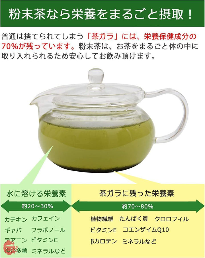 カテキンたっぷり急須で飲むお茶は、茶殻にカテキンが多く残り、実際には30%ほどしか摂取できないと言われていますが、この粉末緑茶はカテキンを100%摂取することができます。 |
