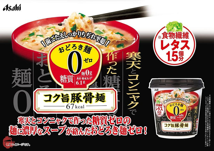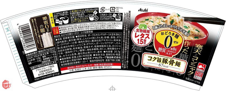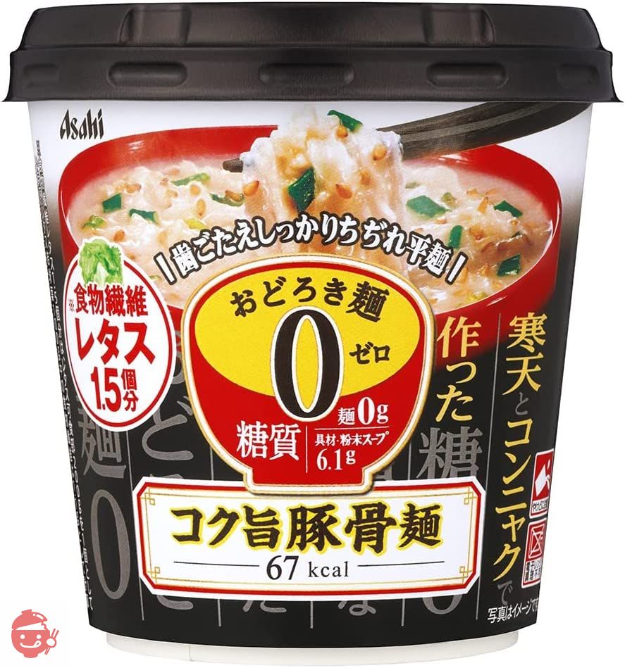 | 原材料 | ポークエキスパウダー(大豆を含む)(国内製造)、寒天麺(寒天、こんにゃく粉)、でん粉、砂糖、食塩、ガラスープパウダー(小麦・鶏肉を含む)、難消化性デキストリン、粉末油脂(乳成分を含む)、いりごま、ゼラチン、ガーリックパウダー、たん白加水分解物、粉末醤油、乾燥ネギ、乾燥背脂加工品、白コショウ末/調味料(アミノ酸等)、増粘多糖類、貝Ca、微粒酸化ケイ素、カラメル色素、酸化防止剤(V.E)、香料 |