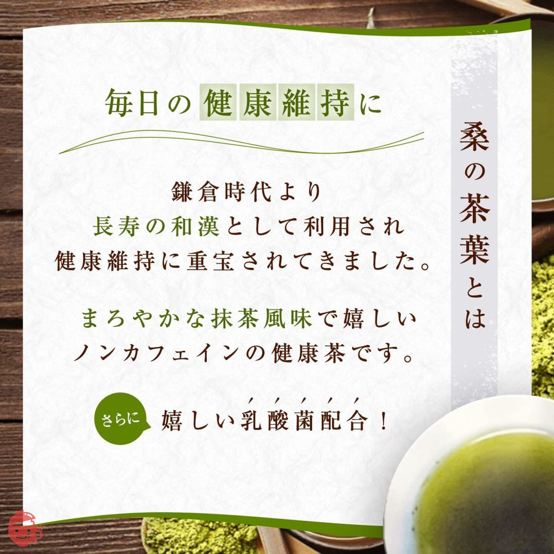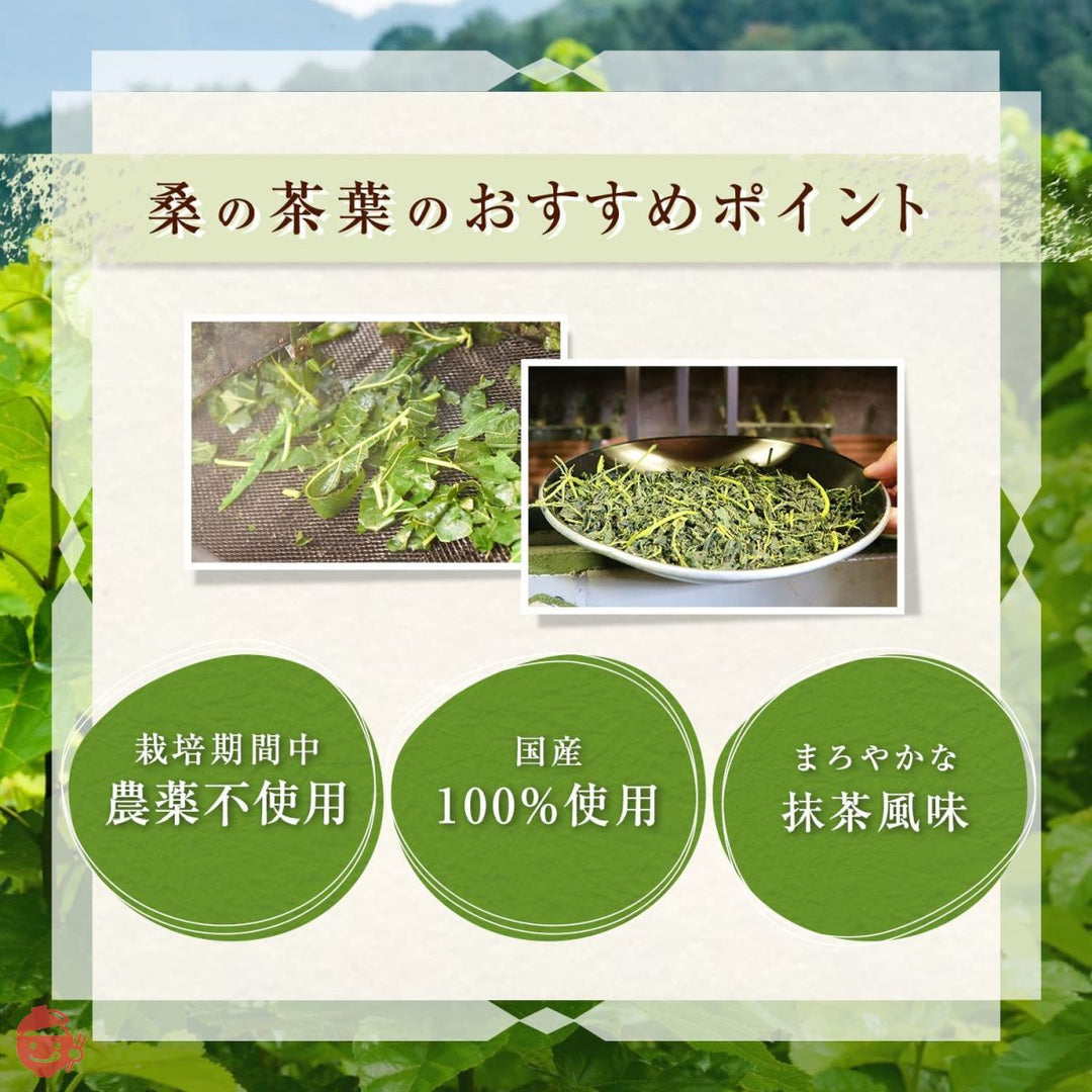 100%国産原料の桑茶パウダー。農薬不使用で栽培された山梨県産の桑の葉を丸ごと粉末にしました。ひと手間かけた『日本茶製法』でおいしくお飲みいただけます。乳酸菌と食物繊維を配合して、飲みやすく腸にやさしく仕上げました。