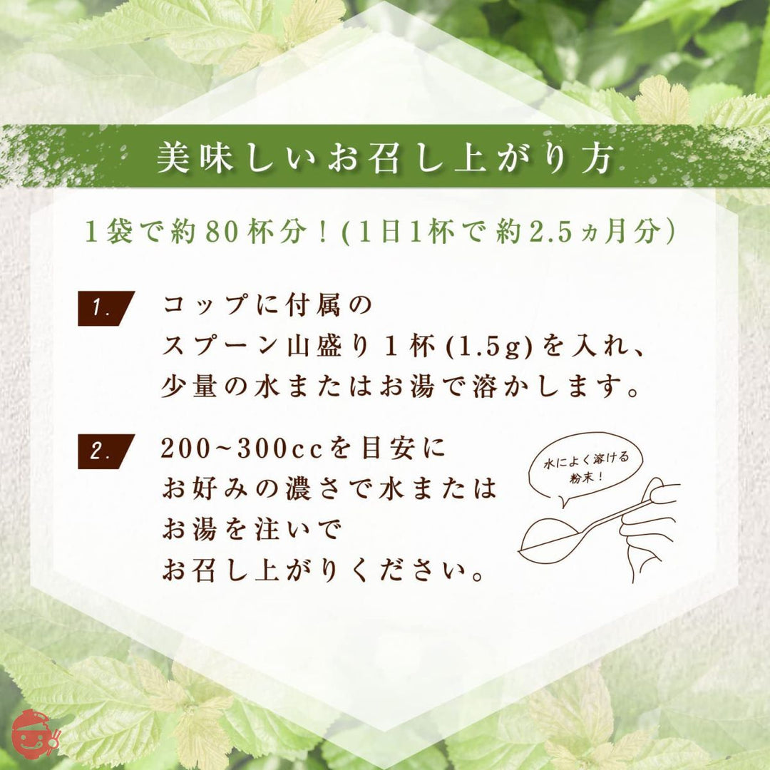 内容量:120g 原材料:桑葉粉末(山梨県産)、難消化デキストリン、乳酸菌