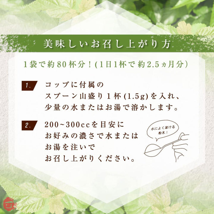 100%国産原料の桑茶パウダー。農薬不使用で栽培された桑の葉を丸ごと粉末にしました。