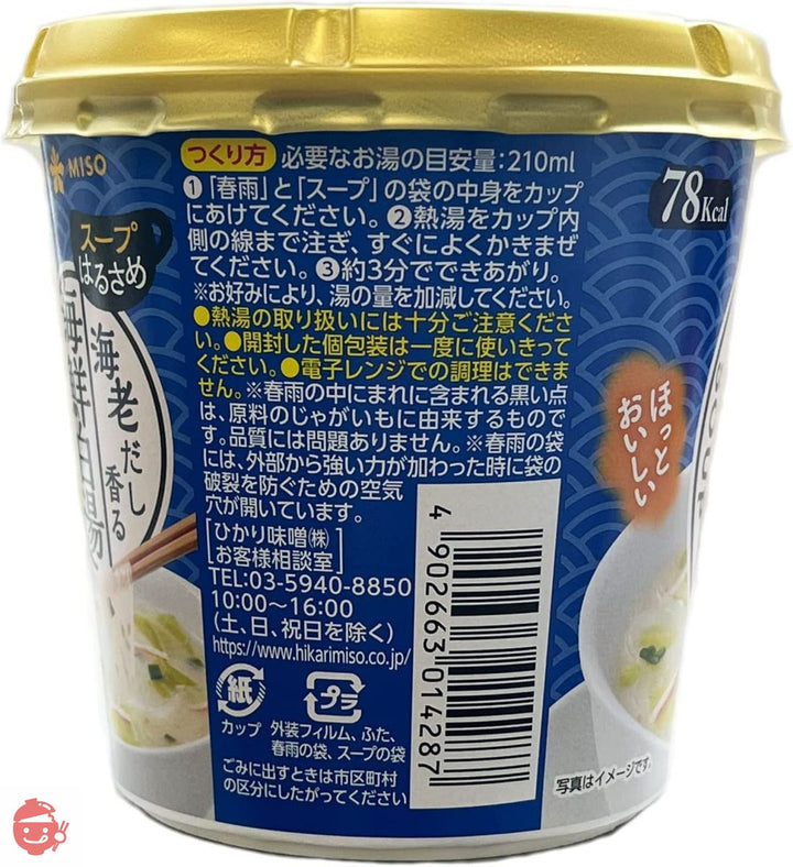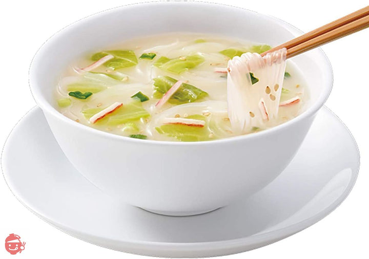 海老だしが効いたコクのあるスープに鶏とあさりのだしを効かせ深みのある味わいに仕立てた海鮮白湯スープ。カップスープはるさめシリーズの中でも濃厚感を感じられる一品です。具はキャベツ、カニカマ、ごま、ねぎ入り。