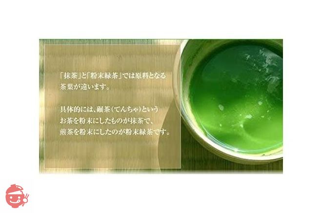 具体的には甜茶(てんちゃ)というお茶を粉末にしたものが抹茶で、 煎茶を粉末にしたものが粉末緑茶です。