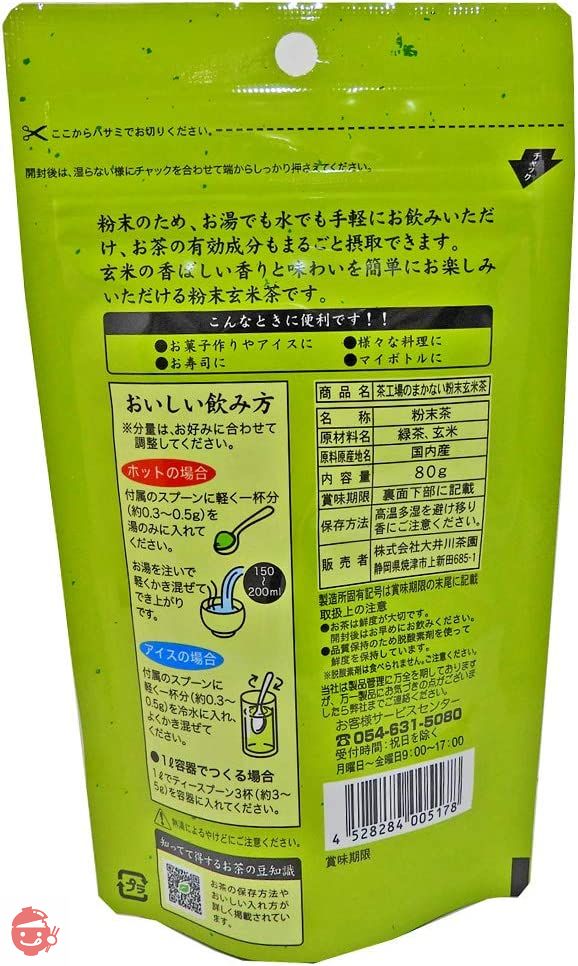 急須なしで飲め、茶殻もでないので便利です。粉末のため、お湯でもお水でもお手軽にお飲みいただけ、お茶に含まれている有効成分もまるごと摂取できます。玄米の香ばしい香りと味わいを簡単にお飲みいただける粉末玄米茶です。料理やお菓子作りなど、様々なシーンでご利用いただけます。