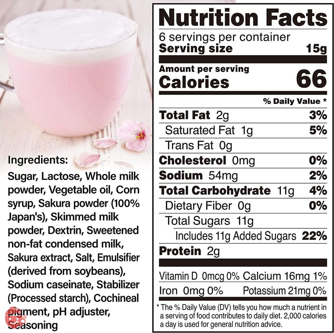 砂糖(国内製造)、乳糖、加糖脱脂粉乳、コーンシロップ、脱脂粉乳、桜パウダー(国産)デキストリン、桜エキス、食塩、植物油脂/乳化剤、カゼインNa、安定剤(加工澱粉)、コチニール色素、pH調整剤、調味料(核酸等)
