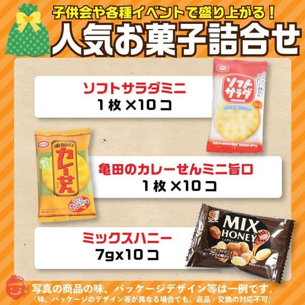 *Example of set contents: Kameda Seika Kameda Curry Sen Mini Umakuchi 1 x 10 pieces, Kameda Seika Rich Cheese Sens 1 sheet x 10 pieces, Kameda Seika Soft Salad Mini 1 sheet x 10 pieces, Kameda Seika Happy Turn 1 sheet x 10 pieces Yasui Foods Thanks Persimmon Pea 6g x 10 pieces Yasui Foods Arare Mayonnaise 5g x 10 pieces Yasui Foods Ramen-chan 6g x 10 pieces Yasui Foods Black Pepper Hail 5g x 10 pieces Ginnoshio Mixed Honey 7g x 10 pieces Hanamaru Creation Hanaokaki 1 Sheet x 10 * Package design etc. are subject to change without notice. (Returns and exchanges are not possible even if the package design is different.)