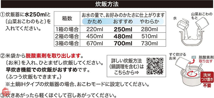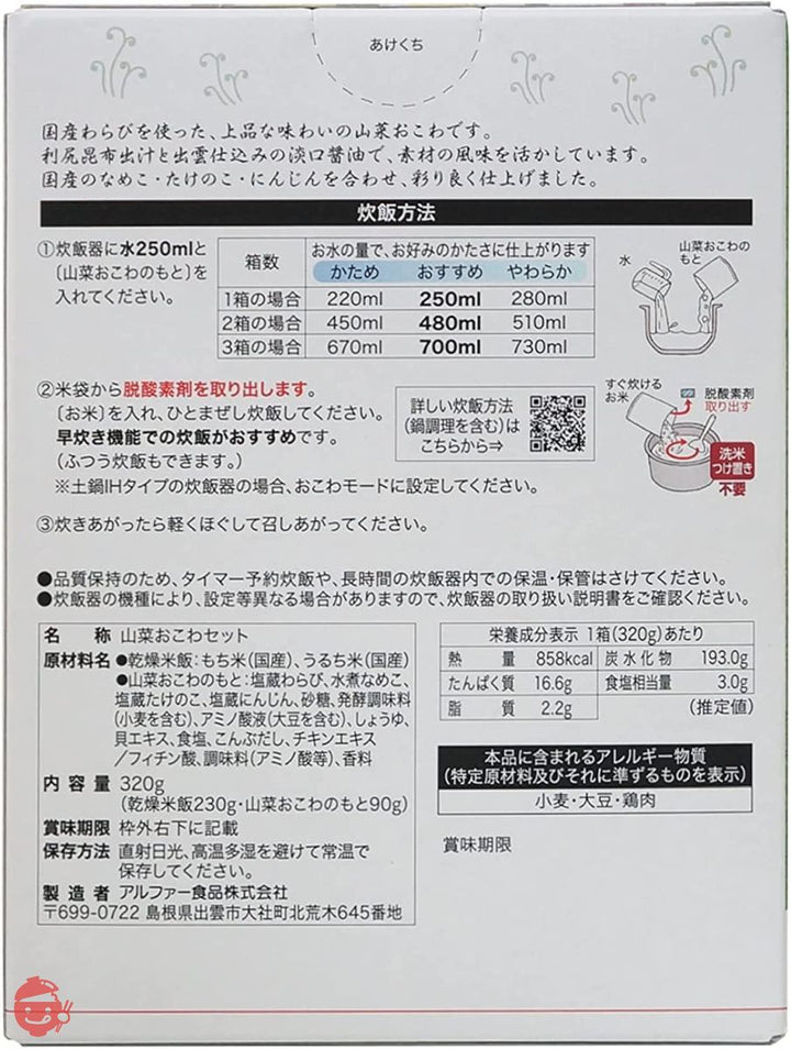 ・Ingredients: Dried rice: Glutinous rice (domestic), non-glutinous rice (domestic) Wild vegetable steamed rice base: salted bracken, boiled nameko mushrooms, salted bamboo shoots, salted carrots, sugar, fermented seasoning (contains wheat), amino acid liquid (Contains soybeans), soy sauce, shellfish extract, salt, kelp stock, chicken extract/phytic acid, seasonings (amino acids, etc.), fragrance/contents 320g (dried rice 230g, wild vegetable okowa base 90g)