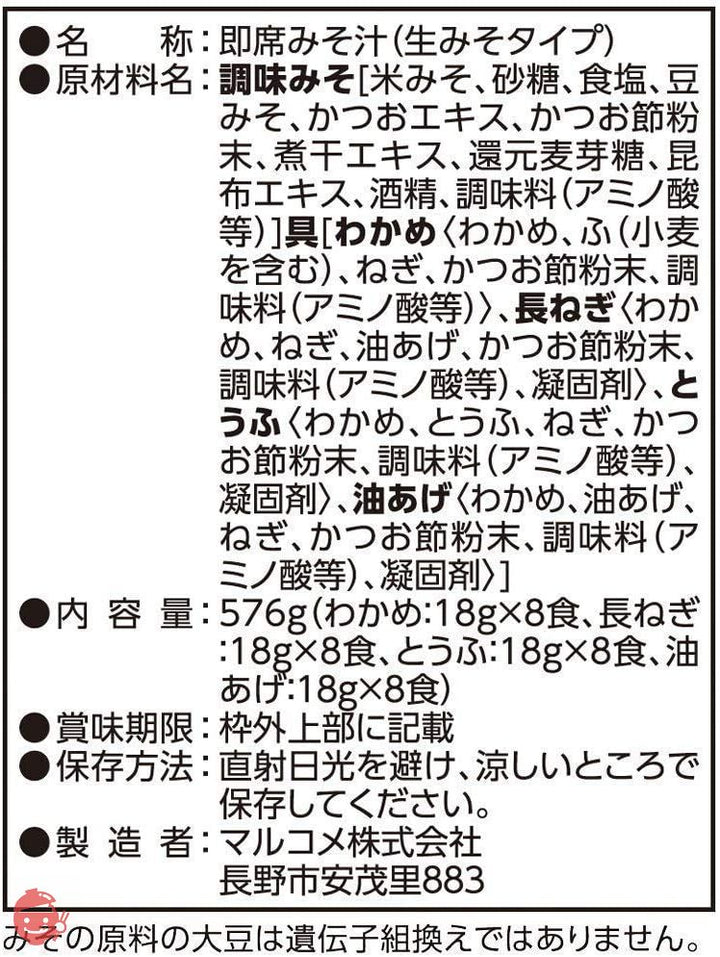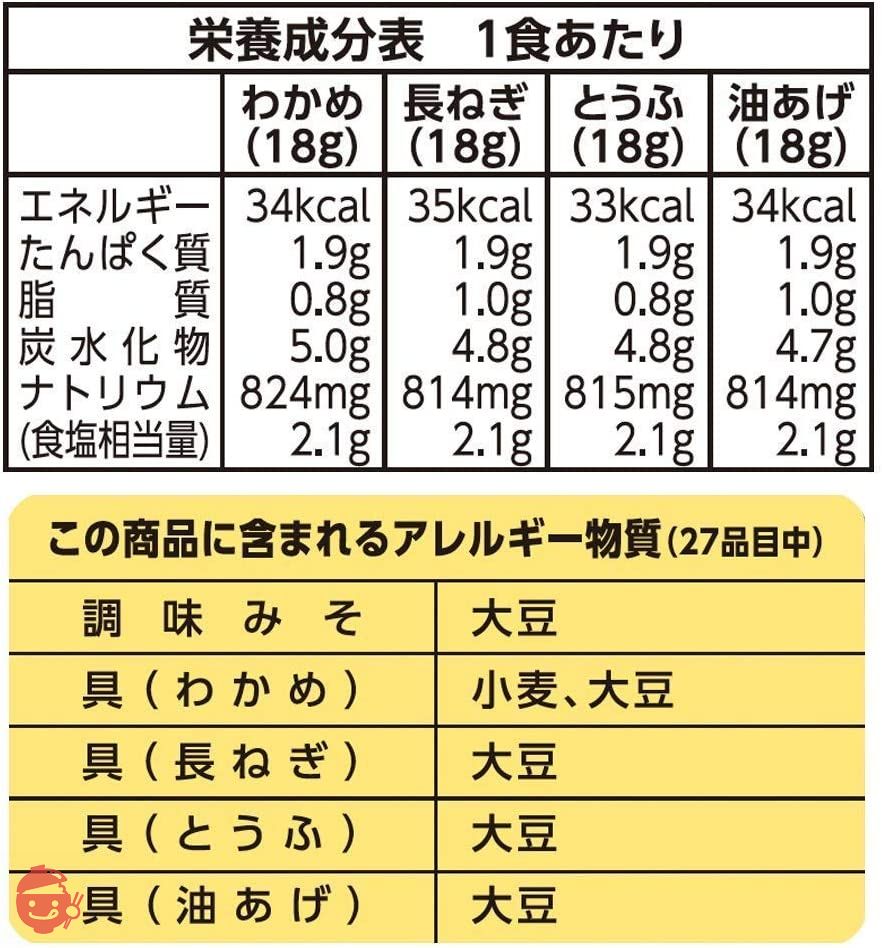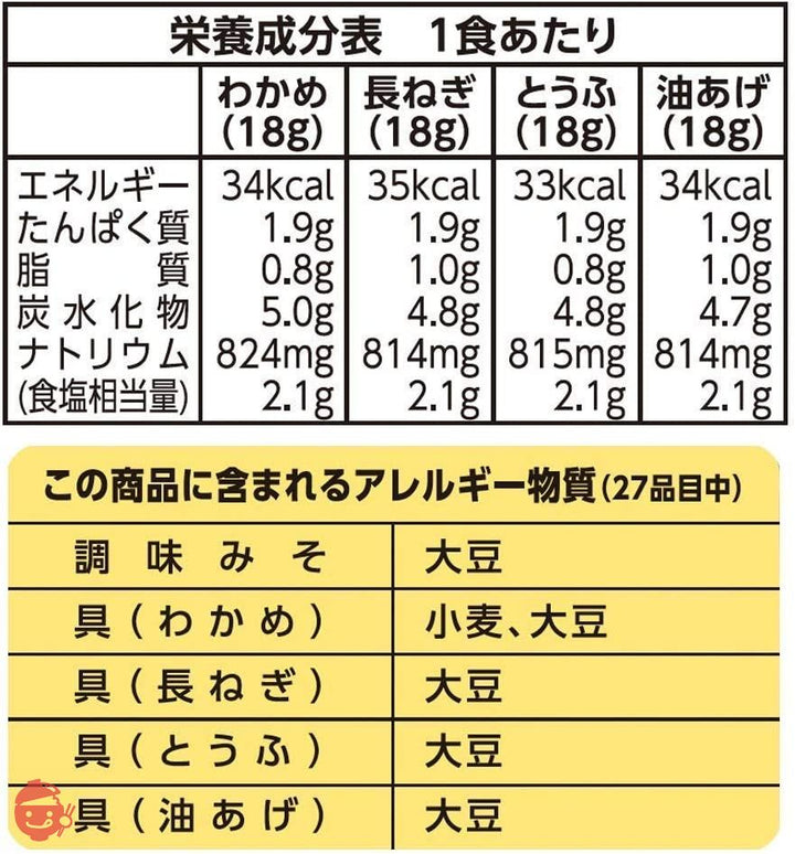 | 原材料 | 調味みそ[米みそ、砂糖、食塩、豆みそ、かつおエキス、かつお節粉末、煮干エキス、還元麦芽糖、昆布エキス、酒精、調味料(アミノ酸等)]具[わかめ〈わかめ、ふ(小麦を含む)、ねぎ、かつお節粉末、調味料(アミノ酸等)〉、長ねぎ〈わかめ、ねぎ、油あげ、かつお節粉末、調味料(アミノ酸等)、凝固剤〉、とうふ〈わかめ、とうふ、ねぎ、かつお節粉末、調味料(アミノ酸等)、凝固剤〉、油あげ〈わかめ、油あげ、ねぎ、かつお節粉末、調味料(アミノ酸等)、凝固剤〉] |