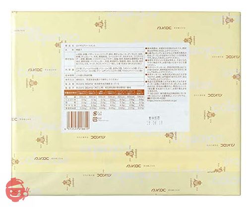 产品(左): 成分:砂糖、面粉、鸡蛋、黄油、植物油、全脂奶粉、可可液块、可可脂、可可粉、脱脂奶粉、咖啡、洋酒、乳糖、食盐、糊精、葡萄糖、乳化剂(大豆)衍生)、调味品(左): 内容量:54 块(甜巧克力 x 18 块、牛奶巧克力 x 18 块、咖啡奶油 x 18 块)