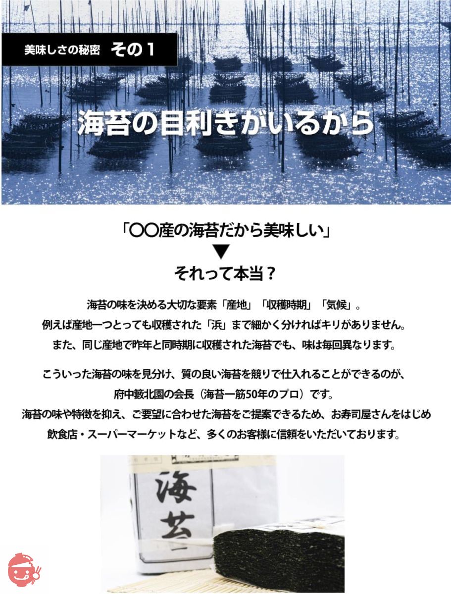 【美味的秘密第1部分】由拥有 50 年经验的海藻鉴赏家精心挑选。 受到江户前寿司店、餐厅、超市等众多顾客的信赖。 |