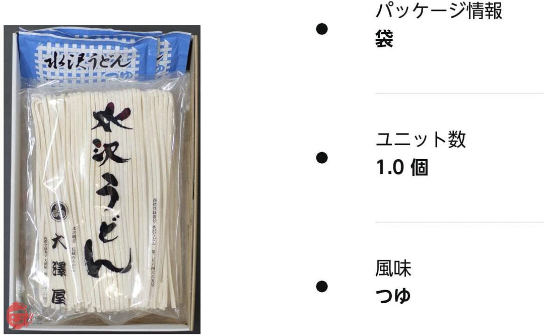 水泽乌冬面是日本三大乌冬面之一。它已有400多年的历史,由小麦粉、盐和大量地下水制成,其特点是质地坚韧、光滑。大泽屋在水泽设有两家店铺,每年光顾的顾客超过 27 万人次。店里卖的生乌冬面是挂在杆子上晾干的,是半生的。配有汤和调味品,让您轻松享用。