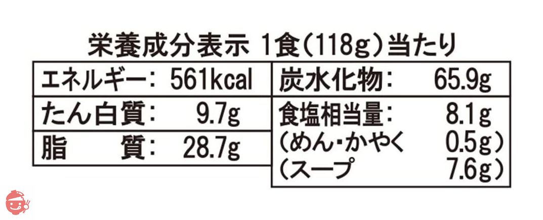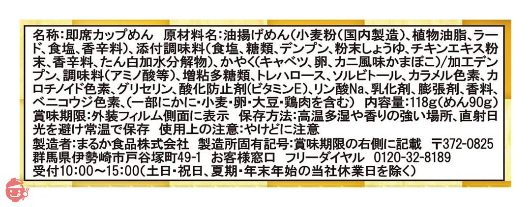 炒面(小麦粉(国产)、植物油、猪油、盐、香料)、附加调味料(盐、糖、淀粉、酱油粉、鸡肉提取物粉、香料、水解蛋白)、卷心菜、鸡蛋、蟹味鱼糕)/加工淀粉,调味料(氨基酸等),增稠多糖类,海藻糖,山梨糖醇,焦糖色素,类胡萝卜素色素,(部分含有蟹,小麦,鸡蛋,大豆,鸡肉)