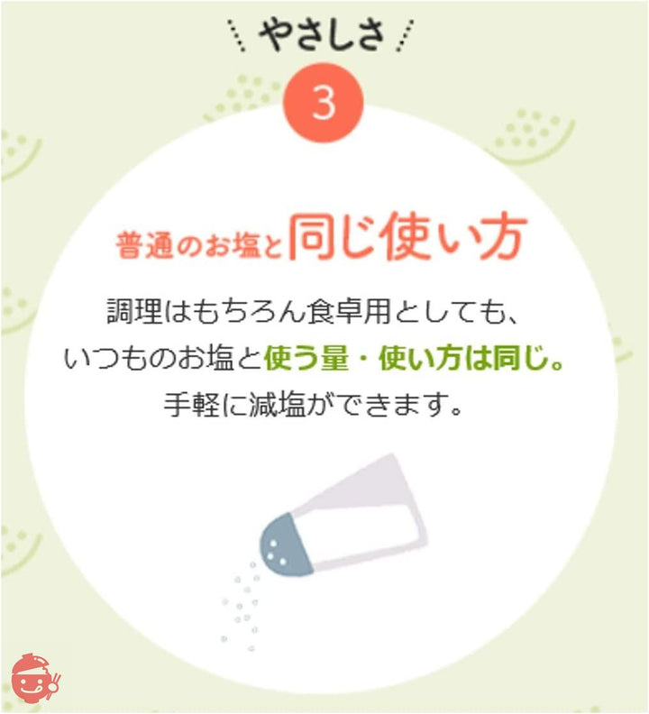 一样的咸味咸度和普通盐一样!您可以享受美味的食物,而不会感到上瘾或不满意。 |