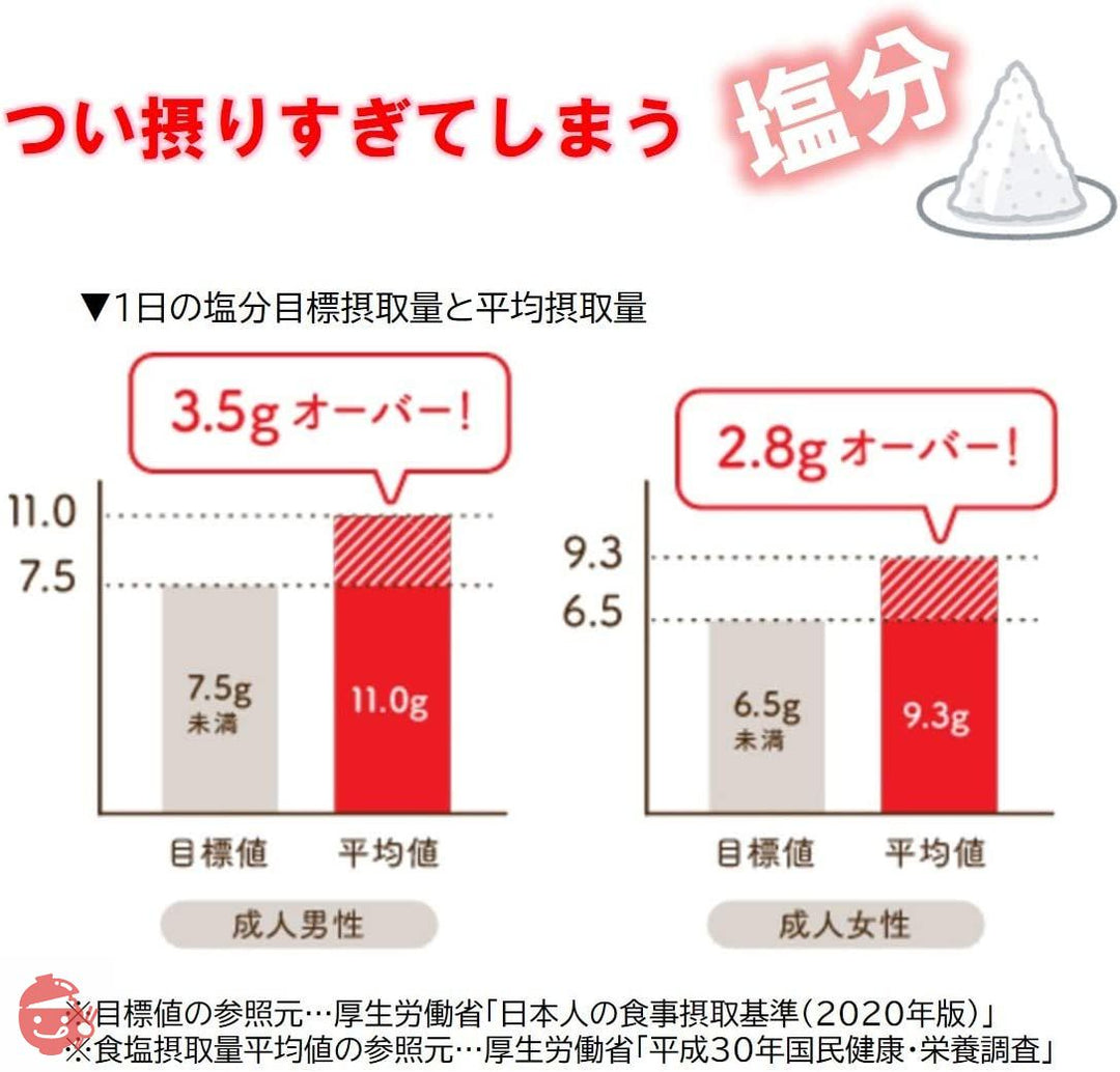 日本人的食盐摄入状况即使放眼世界,日本人也以高盐摄入量而闻名。对比《日本膳食摄入标准(2020)》每日食盐摄入量目标(男性低于7.5克/女性,低于6.5克/女性),成人每日平均食盐摄入量为男性11.0克/人。女性的平均每日摄入量为 9.3 克/天 (*),因此现实情况是女性摄入了过多的盐。 *2018年全国健康与营养调查 |