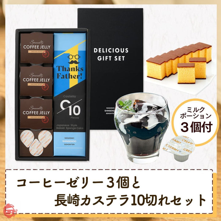 【父亲节卡斯特拉和咖啡果冻】采用最高等级烘焙豆制成的特制咖啡咖啡果冻,以及化妆盒中的“快乐号“黄色卡斯特拉”礼品套装。这是一份送给爸爸的礼物,传达了收礼者的感受。 [产品特点] 快乐黄卡斯提拉 1 颗(已切 10 颗) 保质期:自生产日期起 30 天(如包装上注明)。请存放在避免阳光直射、高温和潮湿的地方。 /外盒尺寸:约27.5x7.0x6.0cm (270g) /包装纸:父亲节礼物专用。 /不含防腐剂、合成色素,可放心享用。 / 3 咖啡果冻 保质期:约 6 个月(如包装上注明)。 / 6 瓶牛奶药水 有效期:自生产日期起 30 天(包装上注明)。请存放在避免阳光直射、高温和潮湿的地方。 [长崎,咖啡的传入地] 长崎出岛,咖啡的传入地。由正在传播出岛精品咖啡魅力的野田真司监制的咖啡果冻。以其清爽、淡雅的口感和柔滑、柔滑的口感而深受人们的喜爱。 【父亲节卡斯特拉】这款优质卡斯特拉的特点是用指尖捏起来就能感受到的柔软、湿润的口感、蓬松的入口即化的口感。时尚而令人印象深刻的设计结合了引人注目的明亮色彩,并带有“谢谢父亲!”字样,这一定会给收件人带来微笑。