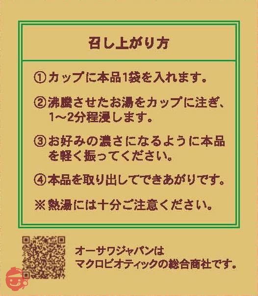 我们使用100%国产有机茶叶。这种番茶(hojicha)由 70% 的茎和 30% 的叶子混合而成,味道清新优雅。将一袋茶包放入杯子中,倒入开水,浸泡 1 至 2 分钟,摇动茶包直至达到所需浓度,然后取出饮用。如果您使用茶壶,请放入 2 袋。