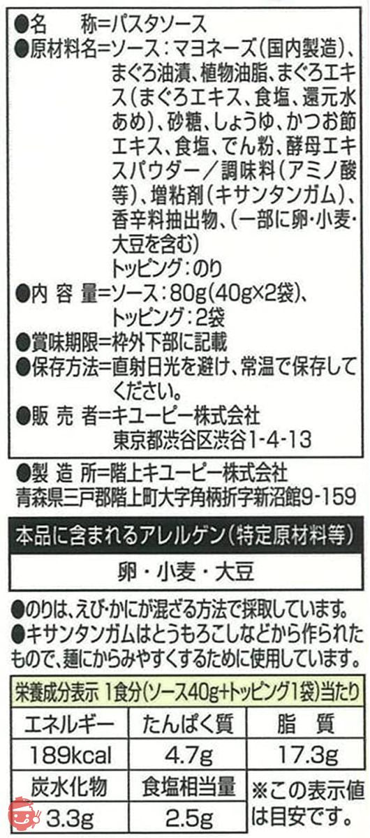 原料: 酱汁:蛋黄酱、油腌金枪鱼、植物油、金枪鱼提取物(金枪鱼提取物、食盐、还原淀粉糖浆)、砂糖、酱油、鲣鱼片、食盐、淀粉、酵母提取物粉末、调味料(氨基酸等) )、增稠剂(黄原胶)、香料提取物、配料:海藻、(部分成分包括小麦)
