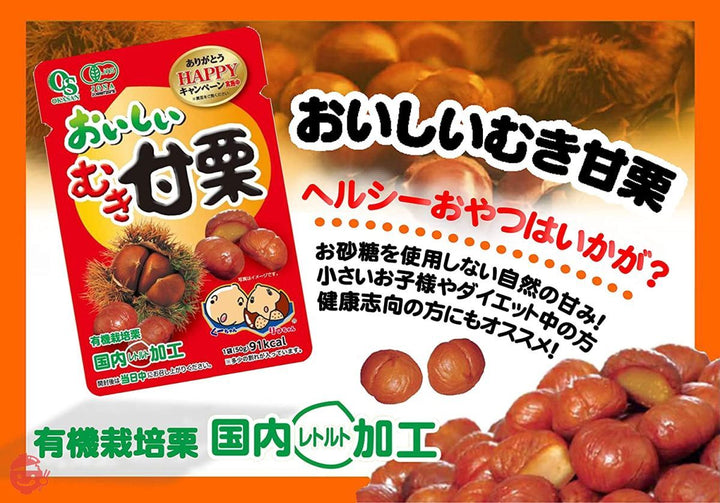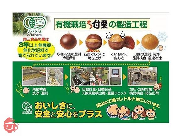 我们对所使用的原材料非常讲究,只使用由有机 JAS 认证的农民种植的栗子。每一颗谷物都经过精心去皮,方便食用。保质期为210天,适合作为腌制食品。在日本进行蒸煮加工,不使用任何防腐剂或添加剂。享受食材的天然甜味。