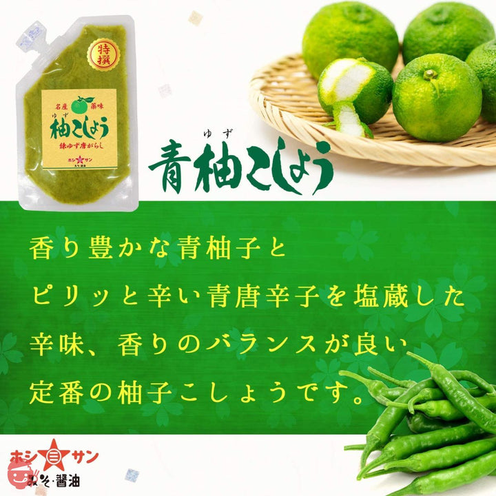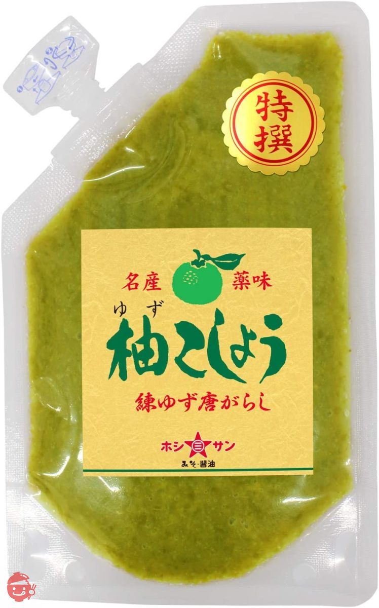 [原料] 辣椒(九州产)、盐、柚子皮 [营养成分(每100g)] 能量:57kcal、蛋白质:2.0g、脂质:1.6g、碳水化合物:10.8g、盐当量:29.0g