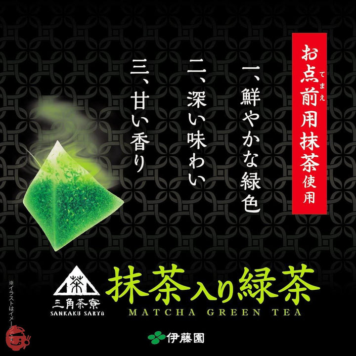 ●静冈县绿茶、日本抹茶静冈县被誉为日本最好的茶馆。 Sankaku Saryo的抹茶绿茶袋中的绿茶使用静冈县的茶叶。 所用的抹茶是国产的石磨抹茶,虽然是袋泡茶,但颜色却是明亮的浅蓝色,味道清新。 |