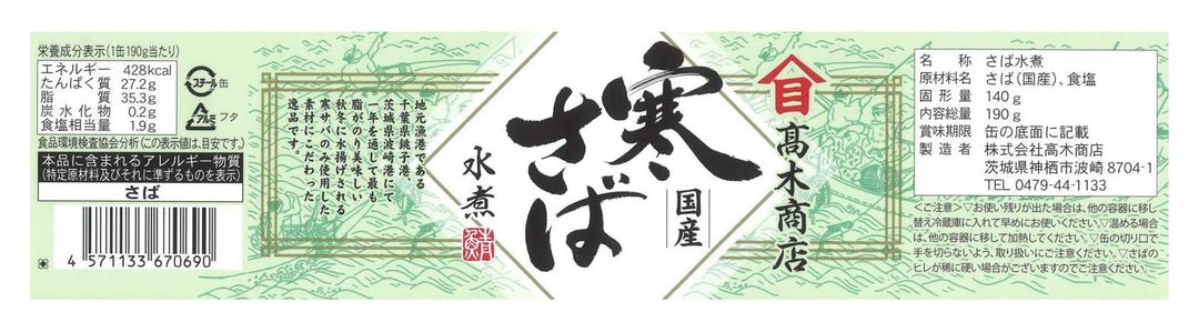 素材: 鲭鱼(国产), 盐 含量: 190g x 6 条 热量: 427kcal/190g 产品尺寸 (高 x 深 x 宽): 18cm x 15cm x 7.8cm