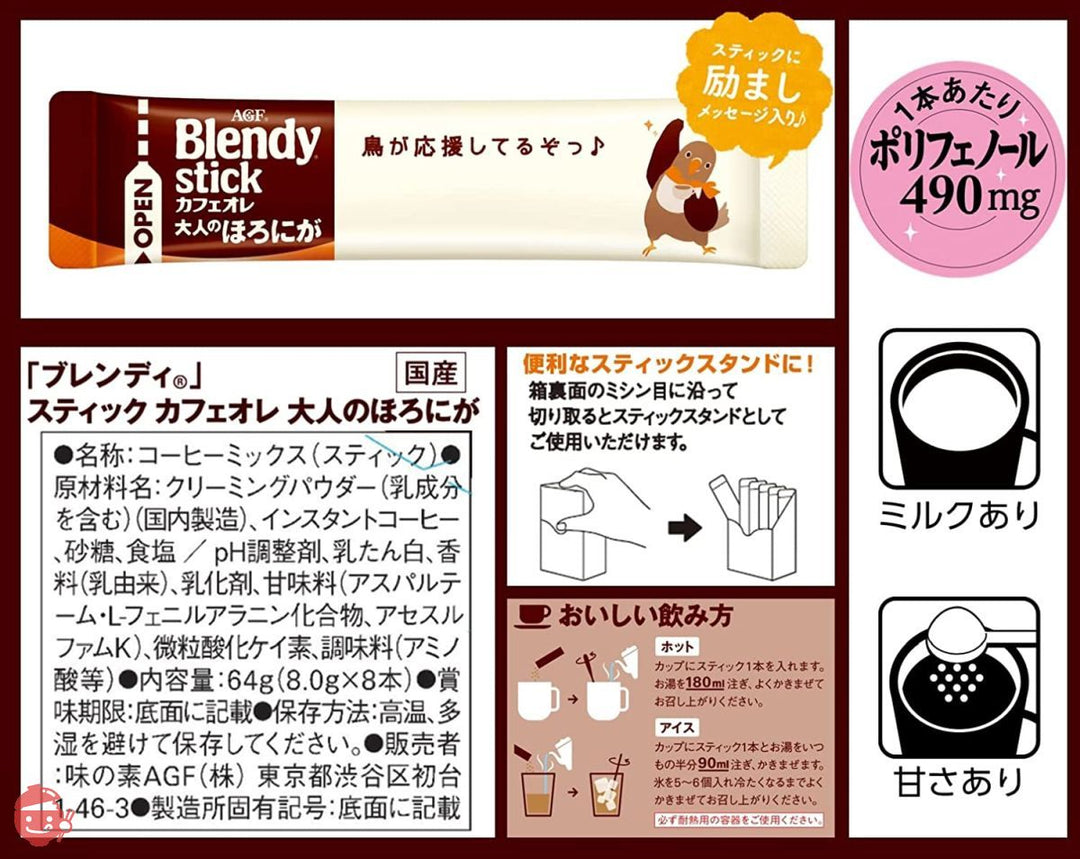 AGF ``Blendy Stick'' 牛奶咖啡 8 成人 horoniga 是一种苦味型牛奶咖啡,采用严选的深度烘焙咖啡豆制成。独立包装的棒状,确保每个杯子始终新鲜。