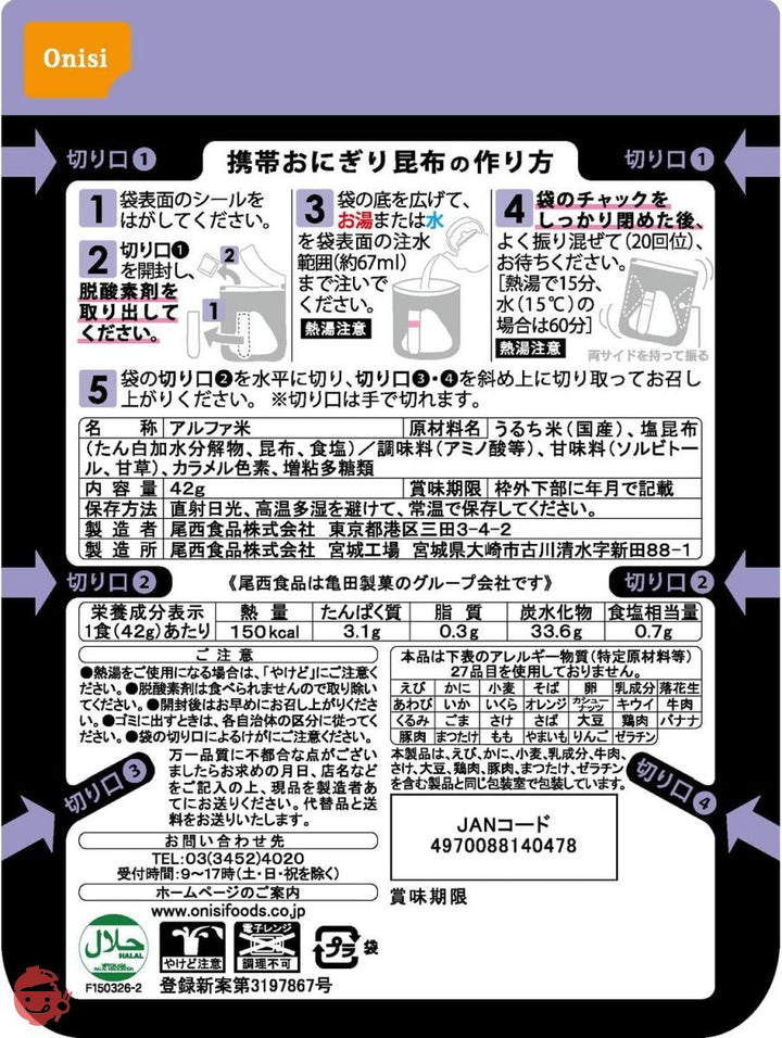 | 原料 | 粳米(国产)、盐海带(蛋白质水解物、海带、食盐)、调味料(氨基酸等)、甜味剂(山梨糖醇、甘草)、焦糖色素、增稠多糖类 |